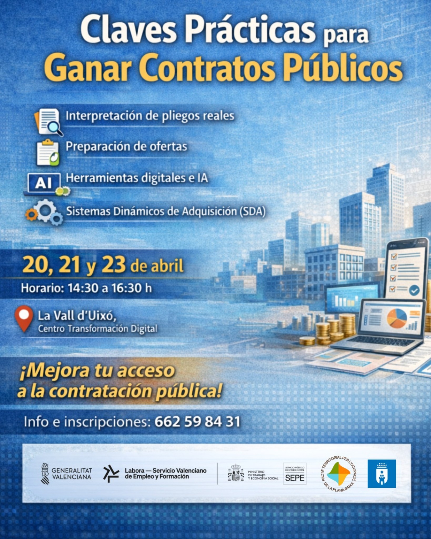 Vols millorar les teues opcions en contractes públics? T’invitem a una formació gratuïta, pràctica i orientada a resultats per a aprendre a detectar oportunitats, analitzar plecs i presentar ofertes més
