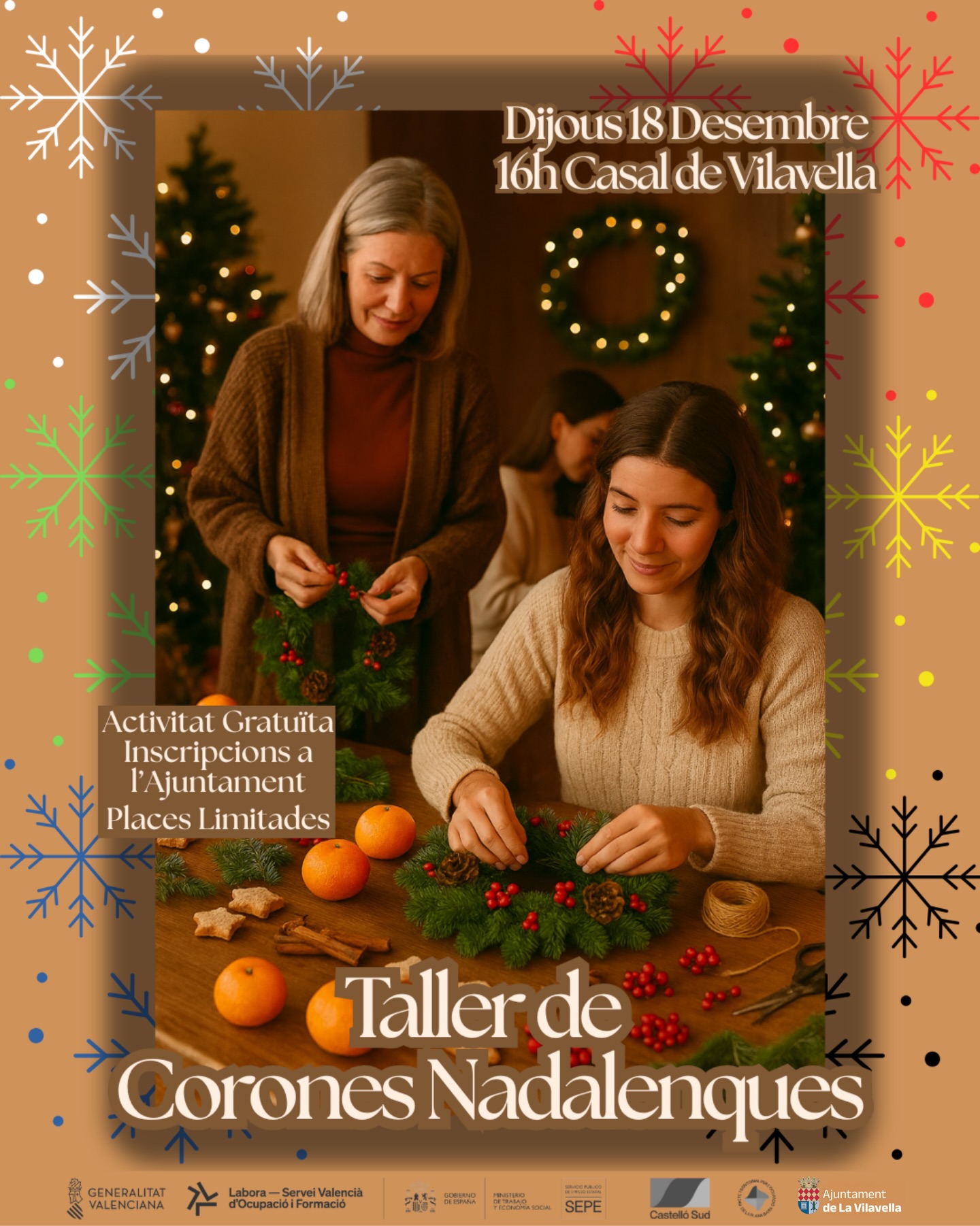 Te gustaría crear tu propia decoración para estas fiestas? Te invitamos al Taller de Coronas de Navidad que tendrá lugar al Casal de la Vilavella.